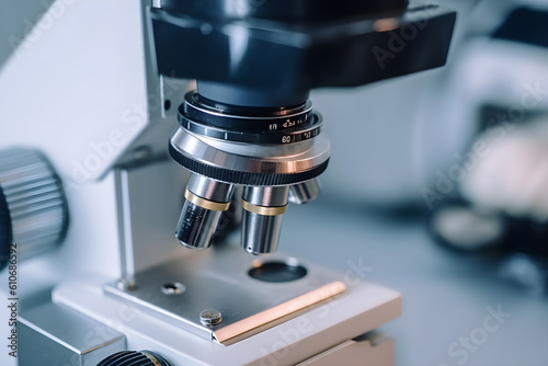 Close-up of a microscope with a metal lens in a laboratory