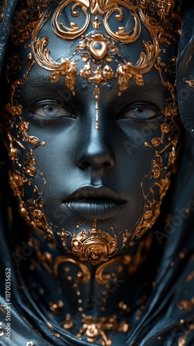 Close-up portrait of a hooded female face, richly decorated with gold patterns and a mystical aura