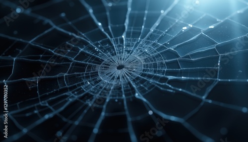 Close-up view of a spider web with dew drops reflecting the light in a serene environment