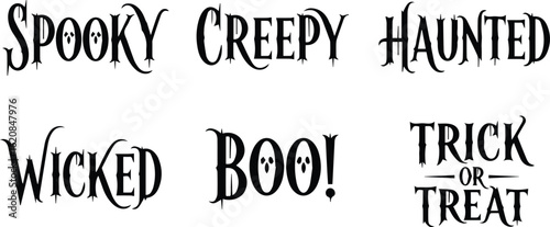 collection of halloween themed words and phrases including spooky, creepy, haunted, wicked, boo, and trick or treat, isolated on white background vector illustration
