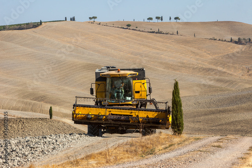 Combine harvester during harvest and the rural landscape of the Tuscany. Italy