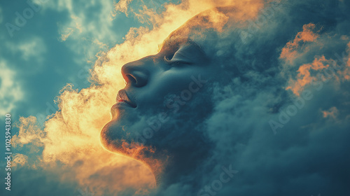 Composition of human face and clouds textures suitable as a backdrop for the projects on mind, dreaming and imagination