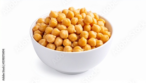 : Cooked chickpeas in white bowl topped with chopped parsley, accompanied by fresh parsley sprig on the side, isolated on white background for wholesome food presentation.