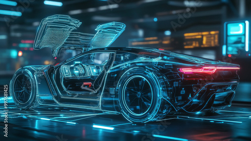 Create a 3D illustration of a futuristic car featuring an intricate wireframe design, with its doors opened to showcase the interior.