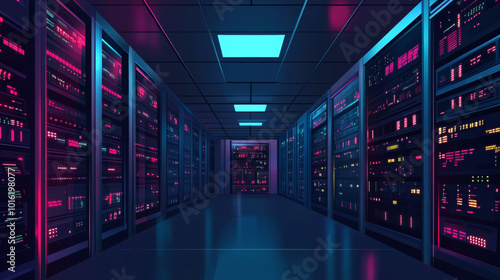 Create an isometric vector illustration of a futuristic energy station, featuring a sophisticated server room rack and a data center.