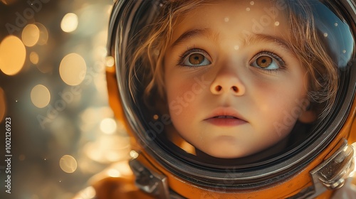 Curious Child in Space Suit Looking Up in Awe, Bokeh Background of Lights, Futuristic Exploration