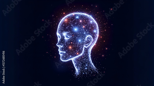 cybernetic digital illustration of a human head created from glowing blue interconnected lines and dots