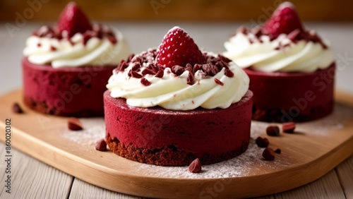 Deliciously tempting red velvet cupcakes with white frosting and fresh strawberries