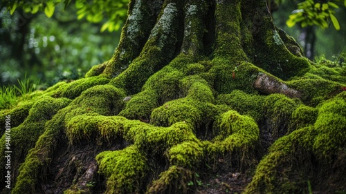 Dense, vibrant moss covering the intricate root system of a tree, creating a lush, green forest floor scene.