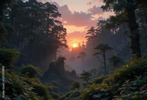 Detailed Dawn Rendering Ultra Realistic Sunrise in a Lush Forest, Stunning Detail and Perfect Lighting Simulation