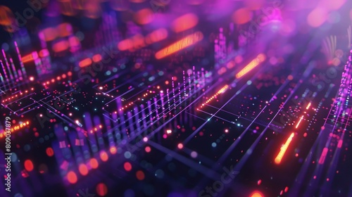 Digital wallpaper with charts and graphs on multiple computer screens, glowing, purple light