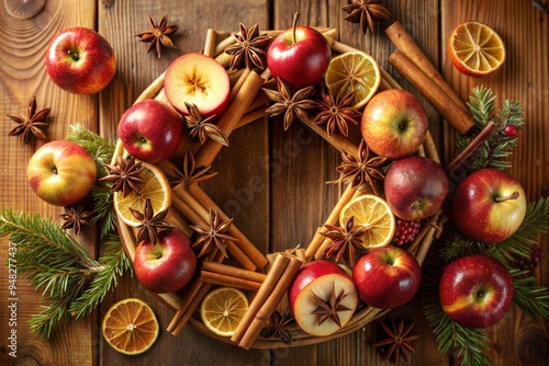 Festive Apple and Cinnamon Autumn Wreath on Wooden Table