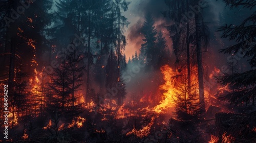 forest fire advancing towards a small community, with flames and smoke threatening homes and wildlife