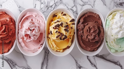 Four bowls, each holding a distinct type of ice cream, sit atop a marble counter A marble countertop lies adjacent