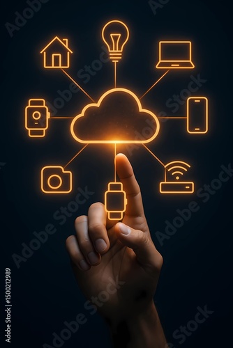 Futuristic cloud computing interface connected to Internet of Things icons and smart devices