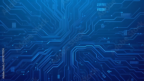 Futuristic vector illustration of a blue circuit board with intricate digital tech elements. Computer motherboard with a chip, processor, and semiconductor. Digital vector illustration