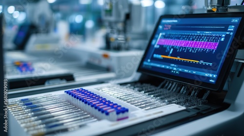 gene chips loaded in the laboratory automated sequencer, robotic arms adding reagents, sequencing progress bar displayed on the screen, background is low - temperature storage cabinet