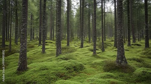 Gęsty skandynawski las z wysokimi drzewami, ich gałęzie tworzą gęsty baldachim.