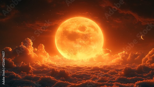 Gigantic Orange Moon Rising Above Fluffy Clouds Under a Dusk Sky with a Distant Crescent Moon Visible