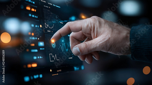 Hand engaging with virtual economy insights, futuristic fintech UI featuring real-time trading data, hovering graphs, stock exchange trends, glowing digital blue aesthetic