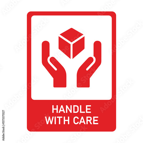 “HANDLE WITH CARE” warning label with two hands gently holding a cube—used to mark fragile items requiring cautious handling during packaging or transport.