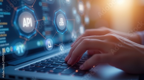 Hands typing on laptop with security hologram icons.