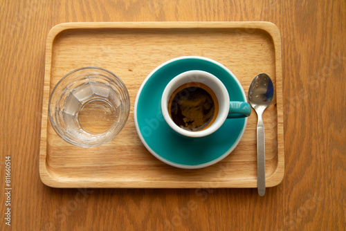 Hot ceramic green coffee cup with drinking water on old wooden table in nature background.