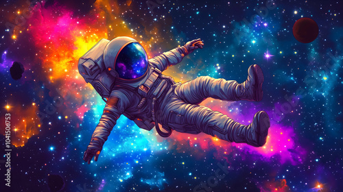 image features an astronaut in freefall amidst the vivid colors of the Milky Way, surrounded by sparkling stars and swirling galaxies