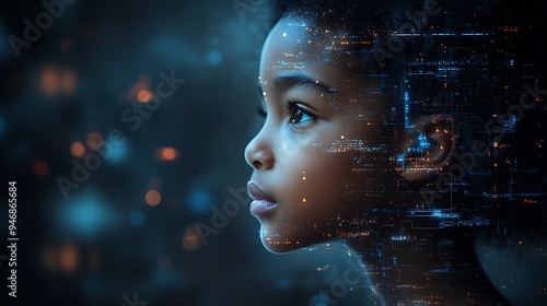 Inclusive image of a of a black IT school student studying at computer learning digital code online software ai cyber security threats. Artificial intelligence cyberspace data coding education