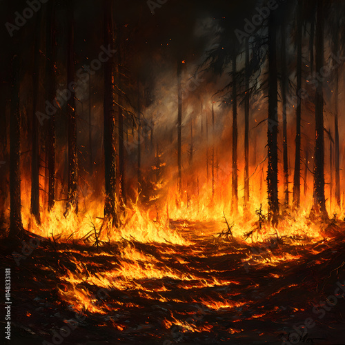 Intense forest fire engulfing trees with flames and smoke, symbolizing the environmental crisis, climate change, and the urgent need for wildfire prevention and forest conservation