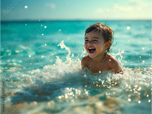 Joyful child laughing while splashing in turquoise ocean waves, summer fun at the beach