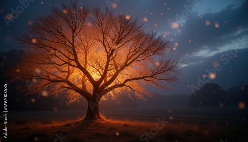 Leafless Tree at Sunset with a Warm Glow and Bokeh Lights