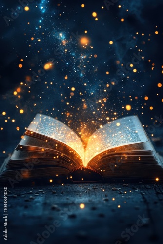 ** Magical Open Book with Glowing Lights and Sparkles Against a Starry Night Sky, Symbolizing Imagination and Fantasy..**