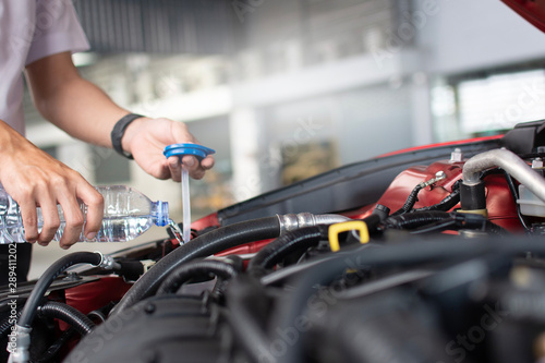 Man service mechanic maintenance inspection service maintenance car Check engine with fill water add water to the wiper car in garage showroom dealership blurred background For automotive automobile
