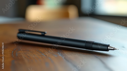 Matte black pen resting on a wooden desk in a minimalistic setting.