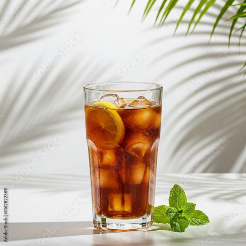 Mazagran Algerian Iced Coffee A tall glass of iced coffee with lemon slices and ice cubes floating inside. The table is shaded by palm trees, with a Mediterranean breeze, golden sunlight, and mint le