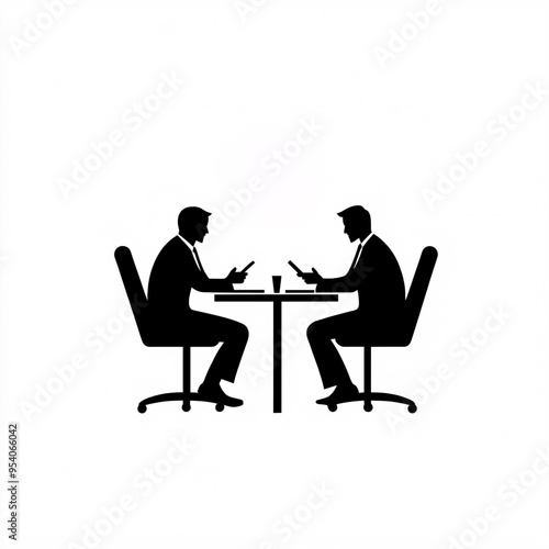 Minimalistic black-and-white silhouette logo of people in a business meeting or discussion around a table, emphasizing teamwork and collaboration in a simple, clean design