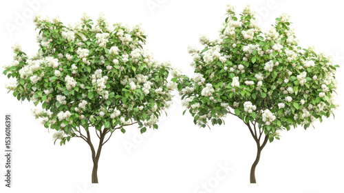 Myrtle (Myrtus) blooming shrubs and trees on white background