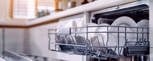 Open dishwasher with clean plates and cutlery neatly arranged inside. The kitchen setting is bright and modern, with light wooden cabinets and a countertop visible in the background.