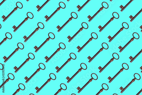 pattern of old rusty keys on a blue background. the key is repeated many times
