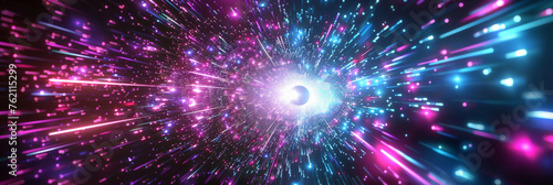 pink, blue, purple light rays from the center of an explosion moving high speed, abstract futuristic background portal tunnel with blue and teal cyberpunk colors on a black background