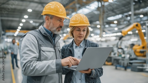 Professional Industrial Engineer Talking with Young Multiethnic Technician at Manufacturing Plant, Using Laptop to Review Production Component Specifications