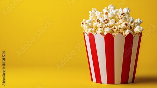 : "Red and White Striped Popcorn Container Full of Fresh Popcorn on Vibrant Yellow Background with Copy Space for Ads