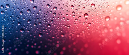 Red, blue, and pink hue backdrop with water droplets on a windowpane..Or..Windowpane displaying water droplets against a