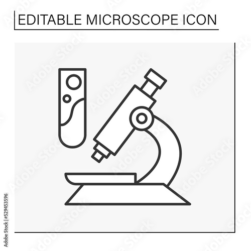 Researching line icon. Analyzing material in a test tube by microscope. Viruses. DNA. Science concept. Isolated vector illustration. Editable stroke