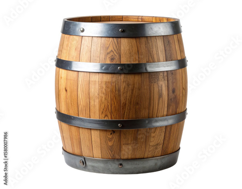 Rustic Wooden Barrel with Metal Hoops – Front View on White Background, AI Generated