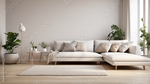 Scandinavian-style living room with a white sofa placed on wooden parquet floor, highlighting minimalist design and natural