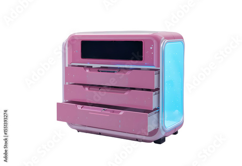 Smart pink chest of drawers with voice-activated drawers, digital lock panel, and LED-lit sides, high-tech design isolated on white.