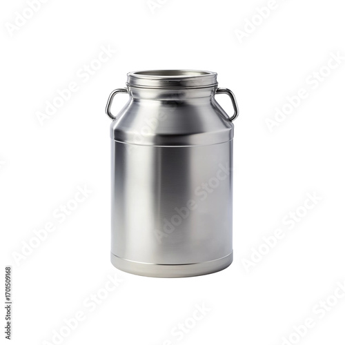 stainless steel milk can, large mouth opening with handle and lid, white background, high-resolution photography.