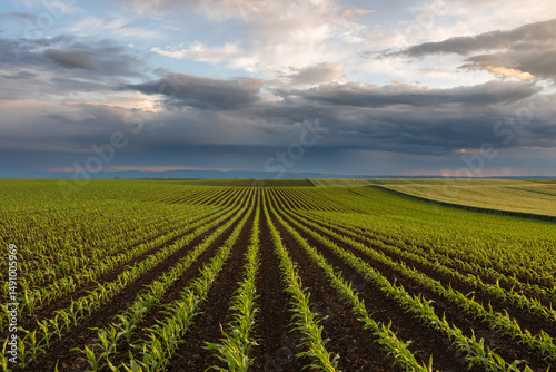 Sunrise over a field of young corn.